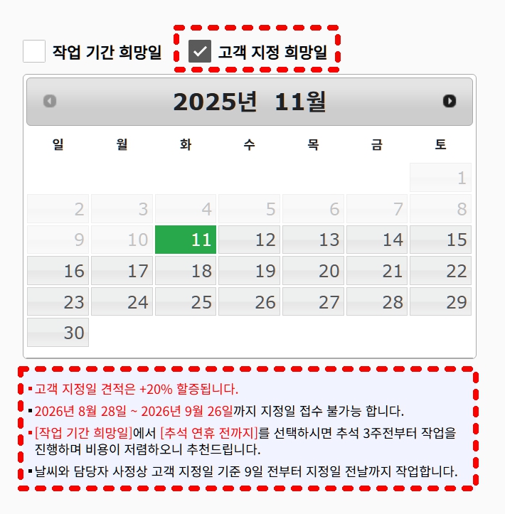 이에 2026년부터 벌초닷컴은 추석 4주 전 접수 고객부터는 작업 예정일 없이 추석 3주전 ~ 연휴 전까지 작업을 완료하며, 4주 이전 접수 고객분들 중 반드시 작업 날짜를 지정하셔야 할 경우 산출 견적(분묘수+면적)에 20% 할증 요금제를 도입 실시됩니다.