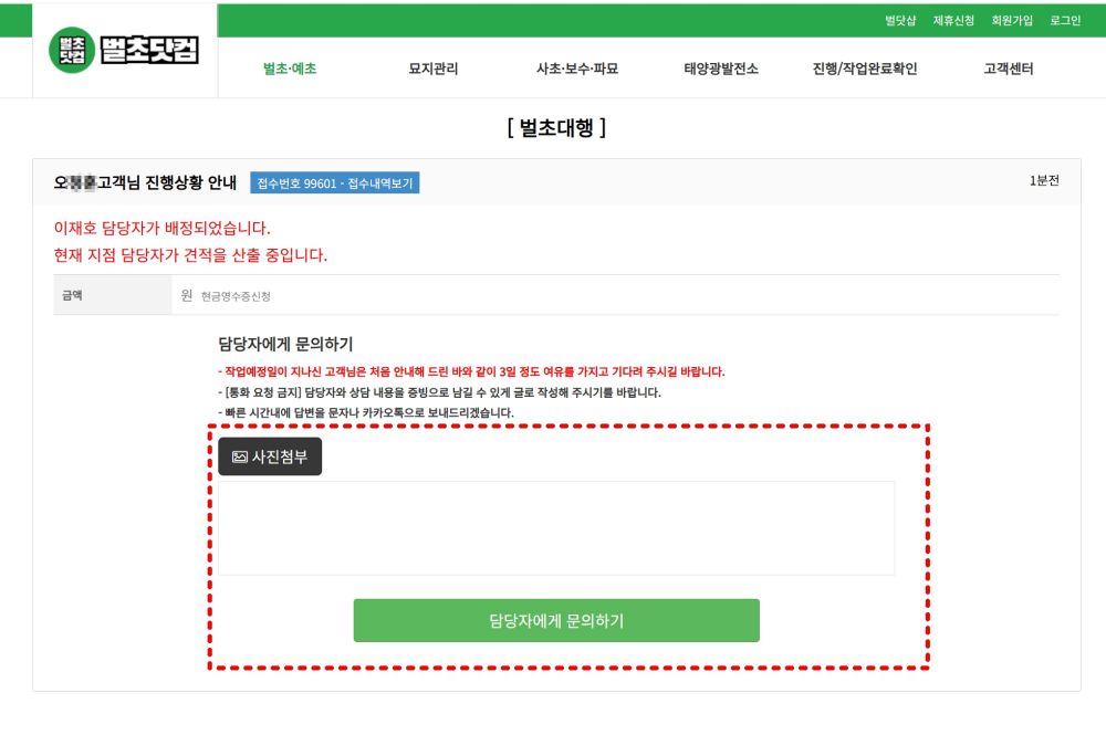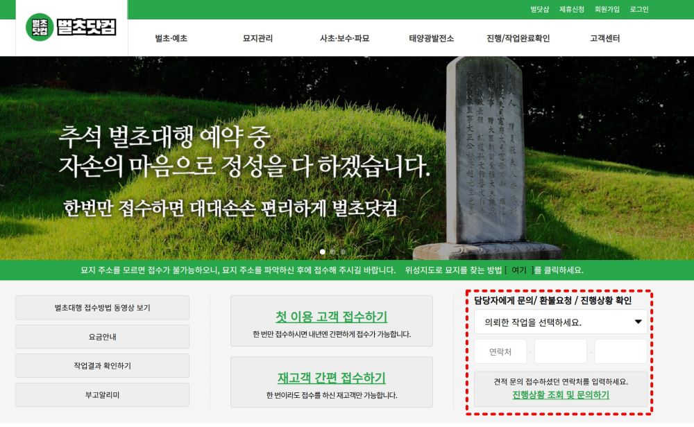 접수 후 일정변경, 환불 등 궁금하신 사항은 고객센터가 아닌 담당자 문의하기를 이용해주셔야 고객님 벌초 담당자가 현실적인 답변을 드립니다.